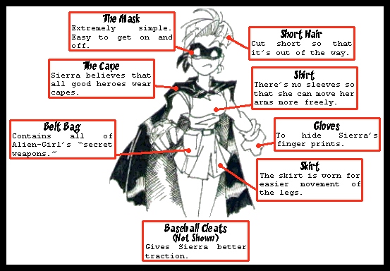 Man, can you believe us? We actually put WORK into designing Alien-Girl's costume! Below is a diagram of what the point of each part of her costume is.